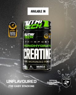 NUTRITECH CREATINE MONOHYDRATE, your go-to muscle building creatine certified by Informed Sports. Packed with 5000mg of Creatine Monohydrate per scoop, providing the muscle building fuel you need, on and off the pitch. Supports explosive training and power output. Increase muscle strength, performance and size. Zero sugar, calories or carbohydrates.