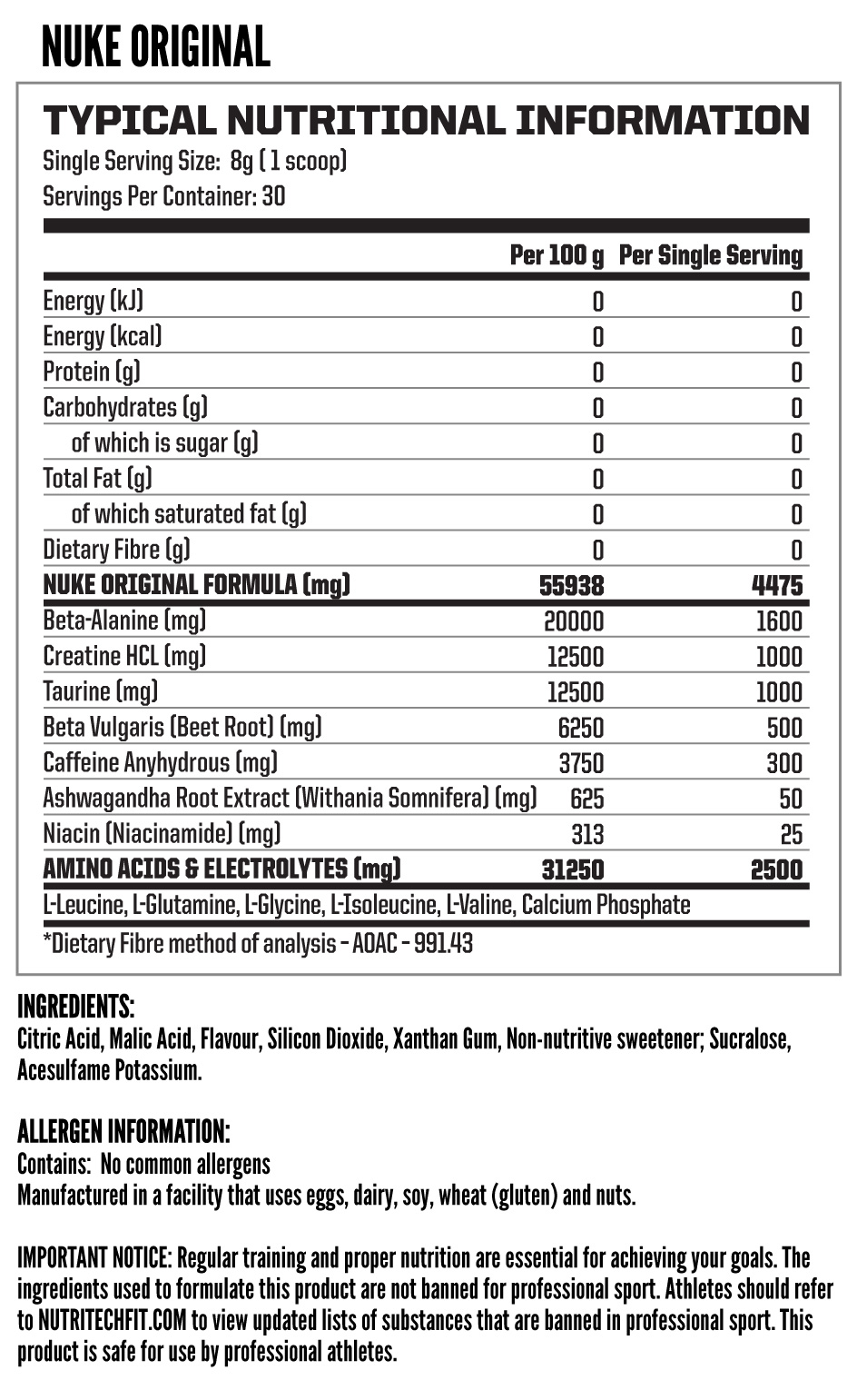 Nuke Original Pre-Workout is a powerful and effective pre-workout supplement designed to help you reach your fitness goals. It contains a blend of caffeine, taurine, creatine HCL, beta-alanine, and beetroot extract, to help you maximize your energy, focus, and performance during your workouts.