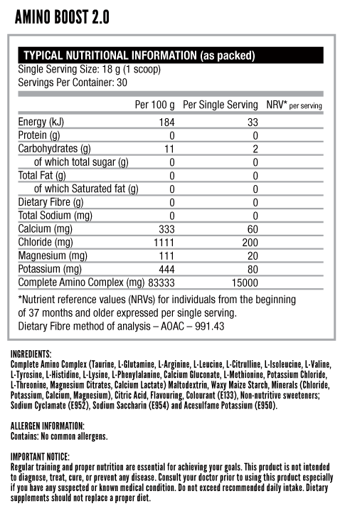 NUTRITECH AMINO BOOST 2.0 is a post-workout designed to refuel and protect lean muscle during and post intense workouts, assist protein synthesis and boost recovery. NUTRITECH AMINO BOOST 2.0 is loaded with an 8:1:2 ratio of Leucine to Isoleucine to Valine, providing a rapidly absorbing instantised Branched Chain Amino Acid formula for muscle recovery. NUTRITECH AMINO BOOST 2.0 combines this BCAA formula with a complete balance of Electrolytes and Minerals to help replenish Electrolytes lost through perspiration.