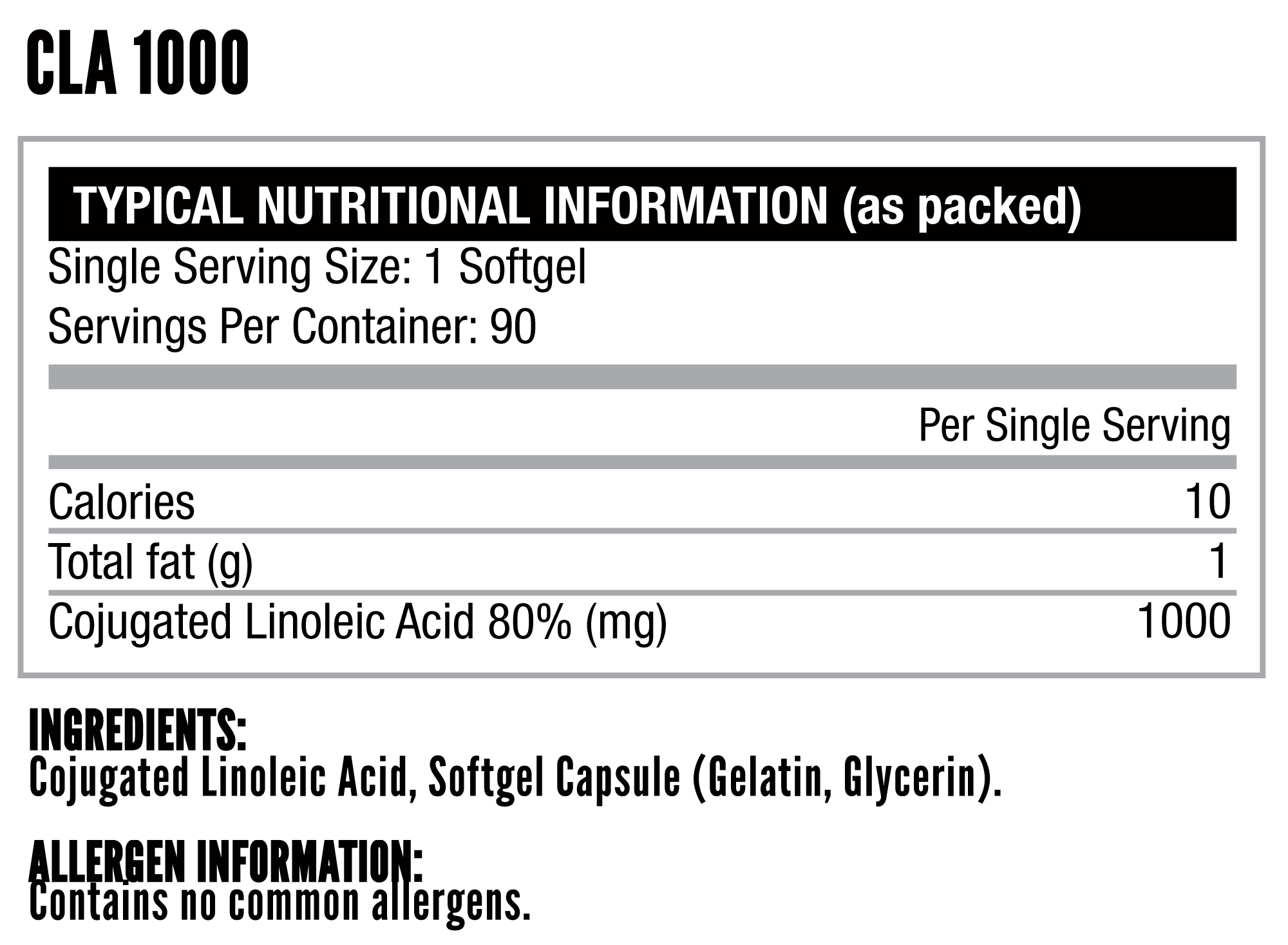 NUTRITECH CLA 1000 has been formulated with 1000 mg of cojugated linoleic acid (80%). Cojugated linoleic acid (CLA) is a naturally occurring fatty acid which is found in various meats and vegetables, but cannot be produced by the body.